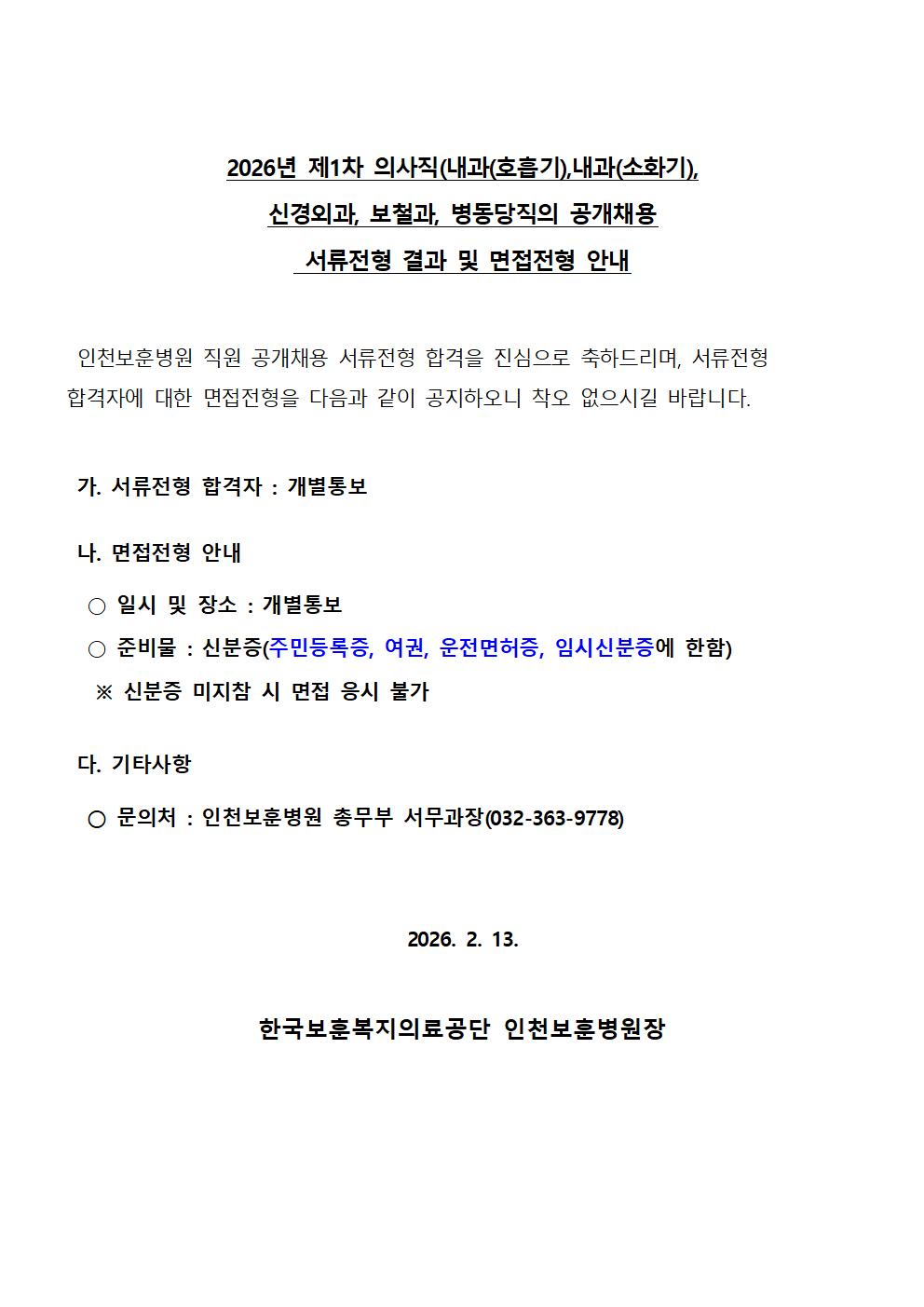 [인천보훈병원] 2026년 제1차 의사직(내과(호흡기,소화기),신경외과,치과(보철과),병동당직의) 서류전형 결과 및 면접전형 안내