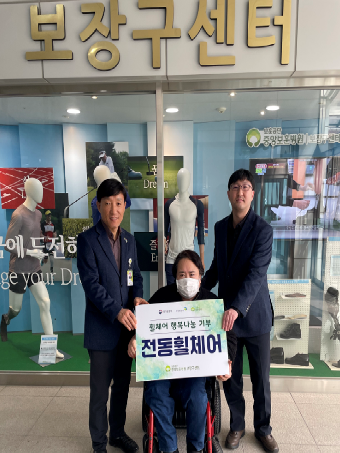 중앙보훈병원 보장구센터(센터장 직무대행 안동영)은 2026년 1월 국가유공자 임병옥님에게 전동휠체어 1대를 장애인 임영은님에게 전동휠체어 1대를 기부하는 휠체어 행복나눔 사업을 실시하였다.