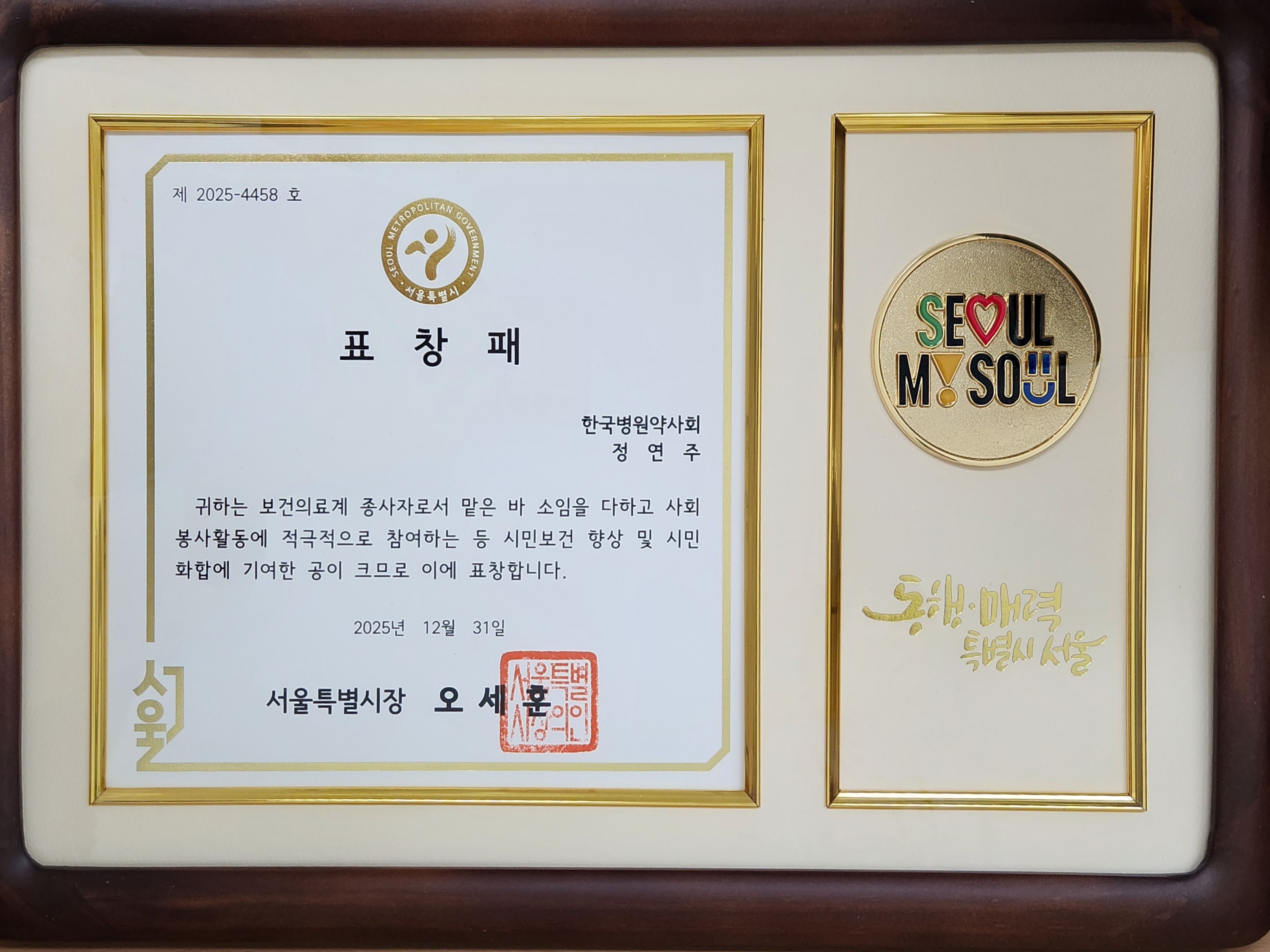 중앙보훈병원(병원장 신호철, 약제실장 연경숙) 정연주 약제부장은 한국병원약사회의 추천으로 서울특별시장 표창을 수상하였다.