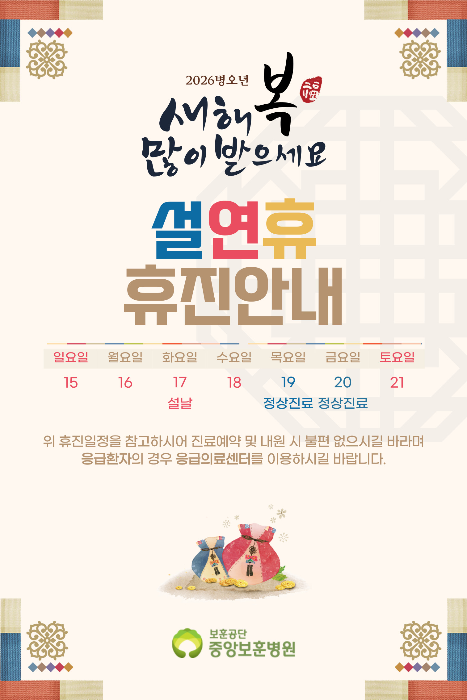 □ 2026년 설 연휴기간 보훈병원 진료계획 및 위탁병원 진료일정을 안내하오니 보훈병원 이용객분들께서는 참고하시기 바랍니다.