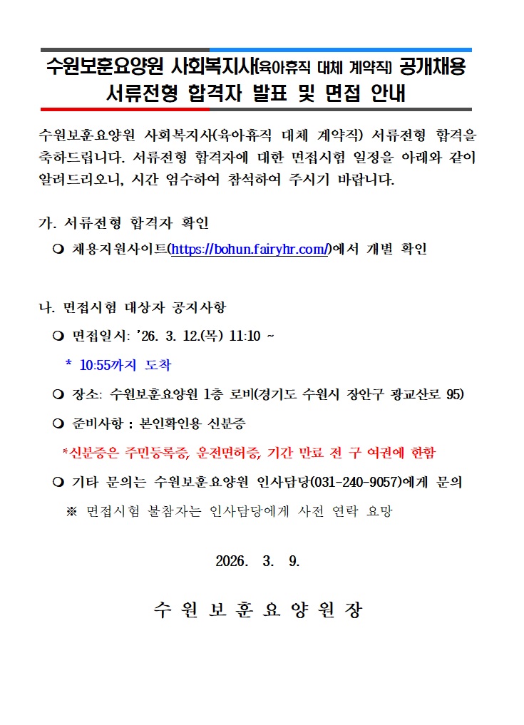 [수원보훈요양원] 사회복지사(육아휴직 대체) 공개채용 서류전형 합격자 발표 및 면접전형 안내