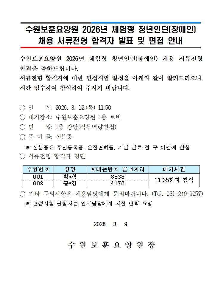 [수원보훈요양원] 2026년 체험형 청년인턴(장애인) 채용 서류전형 합격자 발표 및 면접전형 안내