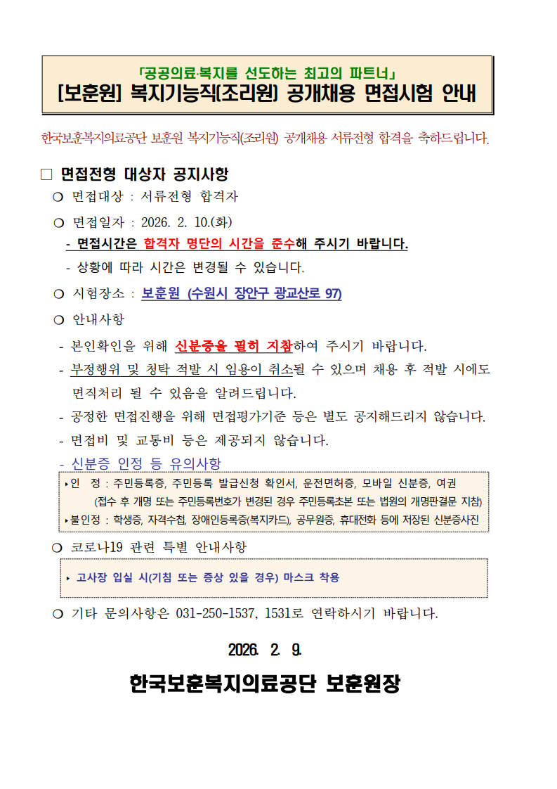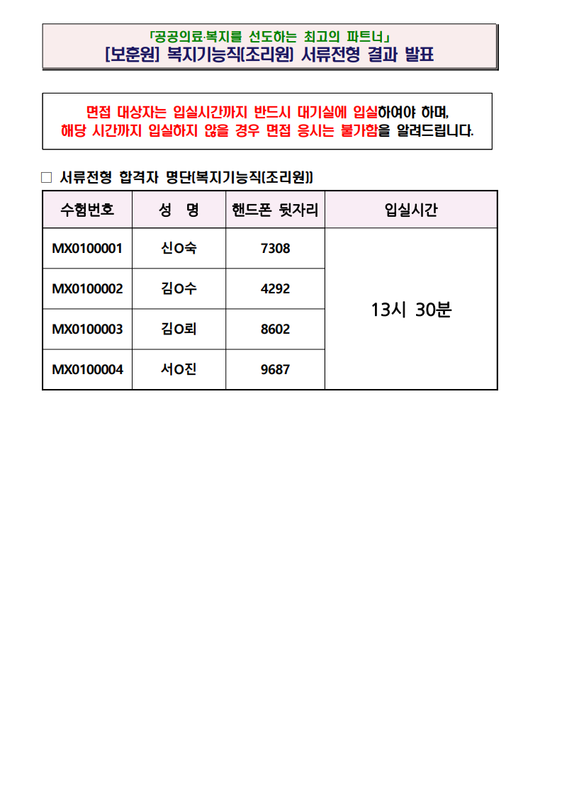 [보훈원] 조리원(계약직) 공개채용 서류전형 결과 발표